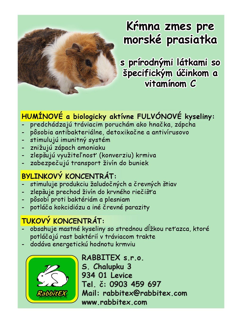 Kompletné prémiové krmivo pre morské prasiatka obsahujúce vyživujúce prírodné látky ktoré priaznivo pôsobia na vývoj zvieraťa, tráviaci organizmus a prevencia proti chorobám.